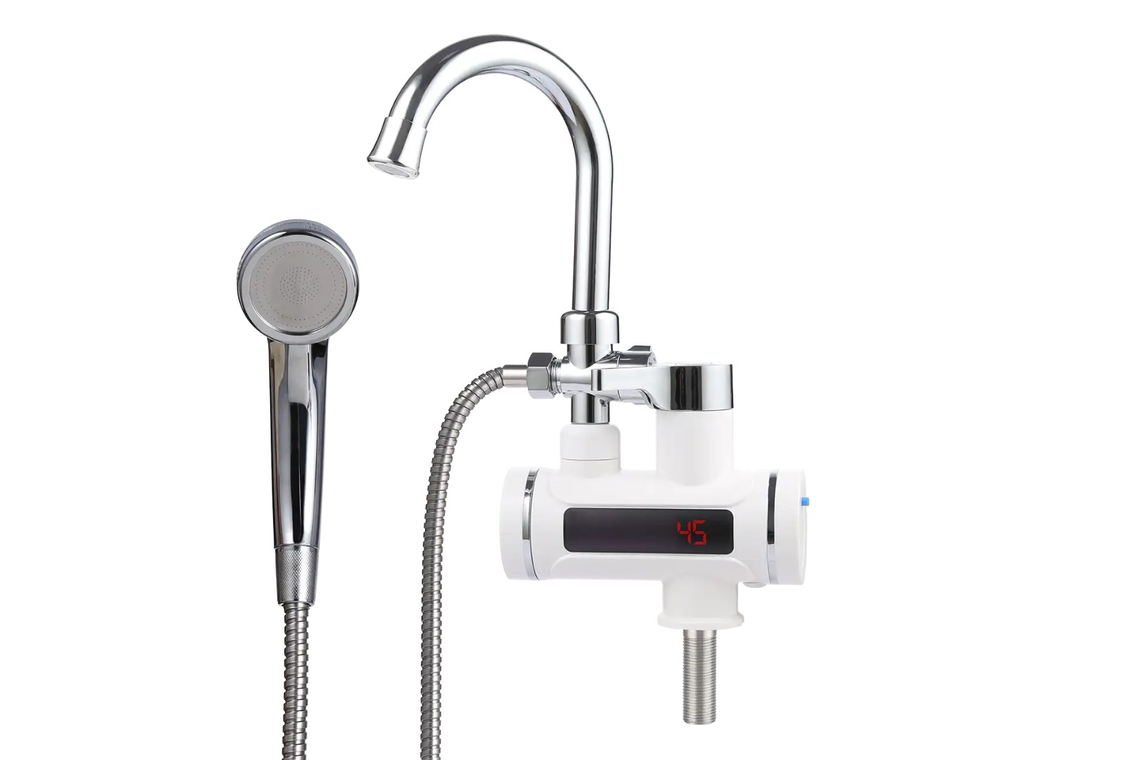 Электрический кран-водонагреватель UNIPUMP серии BEF выполнен в виде смесителя и предназначен для быстрого нагрева проточной холодной воды для бытовых целей в помещениях, где по какой-либо причине нет возможности или целесообразности провести горячую воду или поставить накопительный водонагреватель. На корпусе водонагревателя имеется цифровой дисплей, отображающий температуру воды. Включение и отключение подачи воды, а также установка уровня нагрева производятся поворотом ручки-регулятора. Излив крана вращается на 360°. На электрокабеле моделей, оснащенных душевой лейкой, установлено устройство защитного отключения (УЗО).