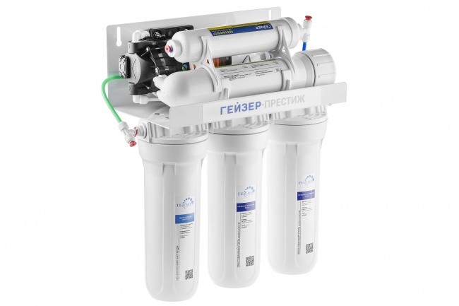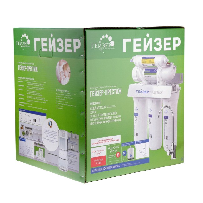 Технология обратного осмоса, использованная в фильтре Гейзер Престиж, заключается в фильтрации воды через полупроницаемую мембрану. Размеры пор мембраны настолько малы, что пропускают только молекулы воды. Размер молекул большинства примесей, а также бактерий и вирусов значительно больше молекул воды, поэтому они не проходят через мембрану. Фильтр Гейзер Престиж П работает при давлении в подводящей магистрали от 0,5 атм. Устройство повышения давления, входящее в комплект, повысит уровень давления до 3-6 атм.