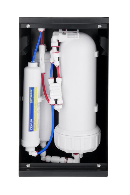 Прямоточный обратноосмотический фильтр без бака в моноблоке Гейзер Vivo 2.0 снижает содержание растворенных солей до минимума. Вода после него не оставляет накипи, в ней отсутствуют вредные примеси — хлор и его соединения, органика, тяжелые металлы, радионуклиды, микропластик, бактерии, вирусы. Такую воду можно пить без кипячения.