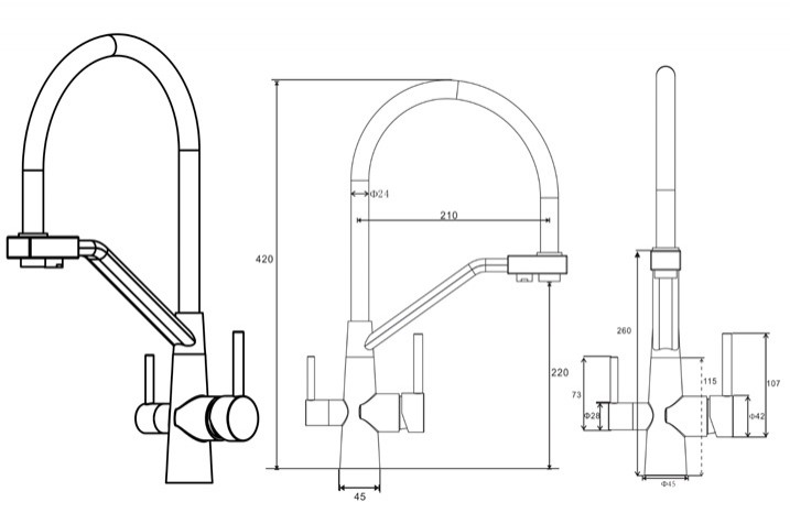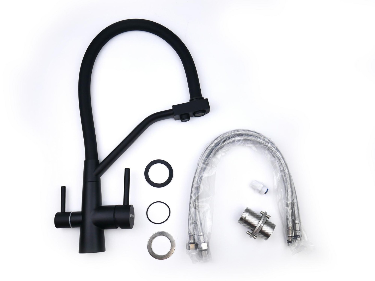 Стальной смеситель с краном для питьевой воды Ниагара дополнен гибким чёрным изливом. Очищенная питьевая вода гарантированно не смешивается с водопроводной, поскольку проходит по разным каналам. В комплекте — переходник для подключения фильтра к смесителю с 1/4"на 3/8".