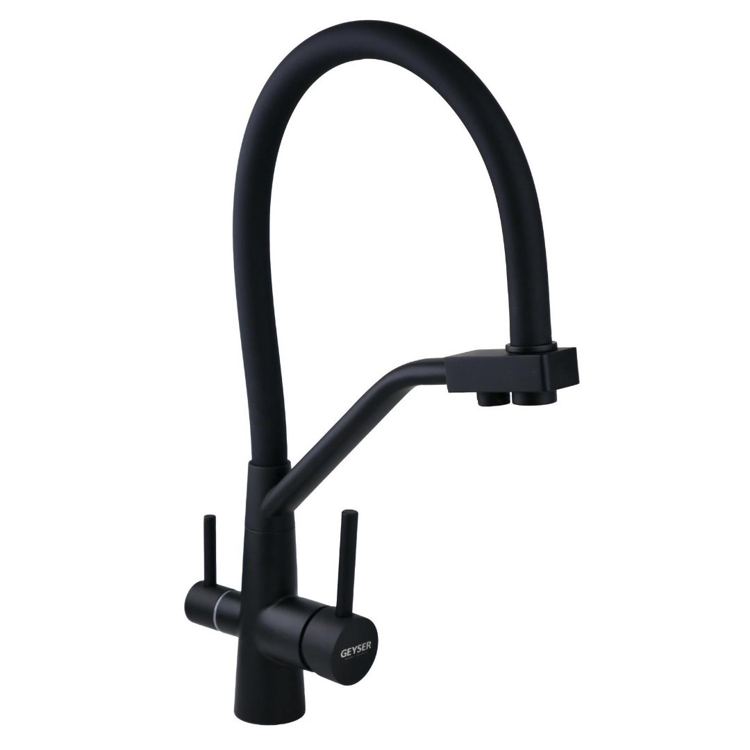 Смеситель Ниагара с выводом очищенной воды черного цвета входит в линейку цветных кранов Гейзер. Это специальные сантехнические изделия для комплектации фильтров для воды: кроме выходов горячей и холодной воды они имеют вывод очищенной воды из фильтра.